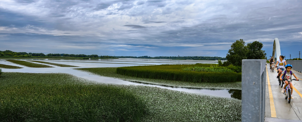 Szendőfi Balázs: Örülök, hogy a víziek mellett a ma már legjellemzőbb szárazföldi kaland: a kerékpározás is megjelent a témák között. Jómagam is szívesen tekerek hosszabb távokat is, a Tisza-tó mentén pedig a terep és a kialakított útszakaszok is ideális és bringásbarát helyszínek. A széles képen a bringás alakok helyzete jól visszaadja azt az érzést, hogy egy hosszan, laposan elnyúló, vízzel telített sík rónaság mellett tekerünk.