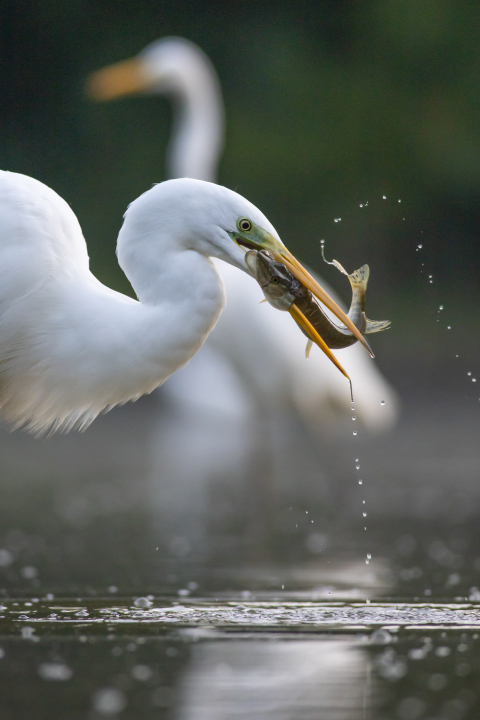 Ez a kép valószínűleg a Tisza-tavon vagy valamelyik öblítőcsatornánál készült (bár ebben száz százalékig nem lehetünk biztosak), de ezen felül is azonnal megragadta a tekintetünket. A képen egy rendkívül izgalmas pillanat látható Magyarország két ikonikus, őshonos halevőjéről. A nagy kócsag a hazai természetvédelem szimbóluma, a csuka pedig a magyar halfauna egyik legkifinomultabb és legrámenősebb ragadozója. Persze itt egy kisebb csuka látható, de ennek ellenére nagyon szemléletesnek találtuk – mintha csak a két világ (víz alatti és feletti) jellegzetes ragadozói csapnának össze. A kép dinamikája is figyelemre méltó. A felcsapódó vízcseppek, a hal testének állása és farkának bemozdulása, valamint a kócsag szigonyszerű csőre szépen vezetik körbe a tekintetet a témán. A kócsag a kopoltyúfedő mögött ragadta meg áldozatát, így a csuka feje szépen kikörvonalazódik. Az arányok is jók, továbbá a háttérben elmosódott másik kócsag miatt nem válik túl sterillé a kép.